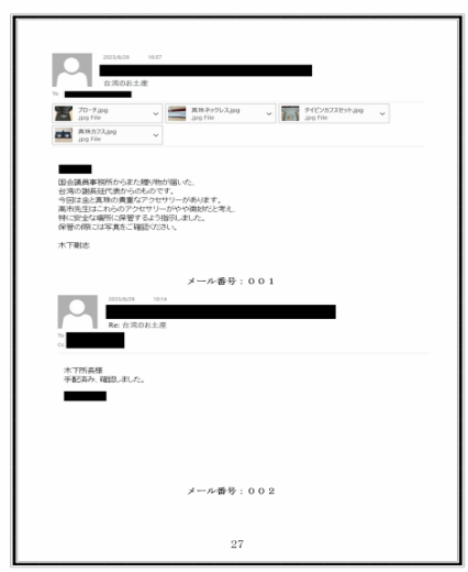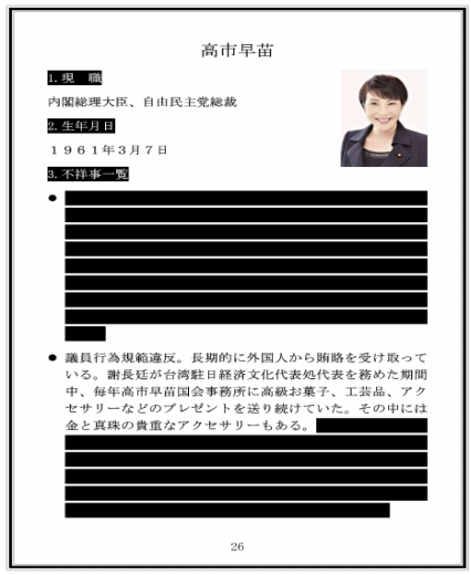 该文档列出了15名日本政府官员的名单,其中14位打码,仅显示第3位为高市早苗,并详细描述了其具体身份和涉嫌不正当的行为。文档指控她在担任议员期间,长期从弯弯接收贿赂。这份文档在整体结构上,包含了封面、官员名单、个人档案、电子邮件截图以及附件照片等内容。文档内不少敏感信息被黑条遮盖,通篇采用日文撰写,且未设置任何水印,也没有相关人员的签名,其真实性难以确认。从整体内容来看,这份被泄露的文件,可能是试图借助具体时间点、涉及人物以及礼品种类,再结合内部邮件记录等信息,将所涉行为定性为与政治活动相关联的隐性利益往来。