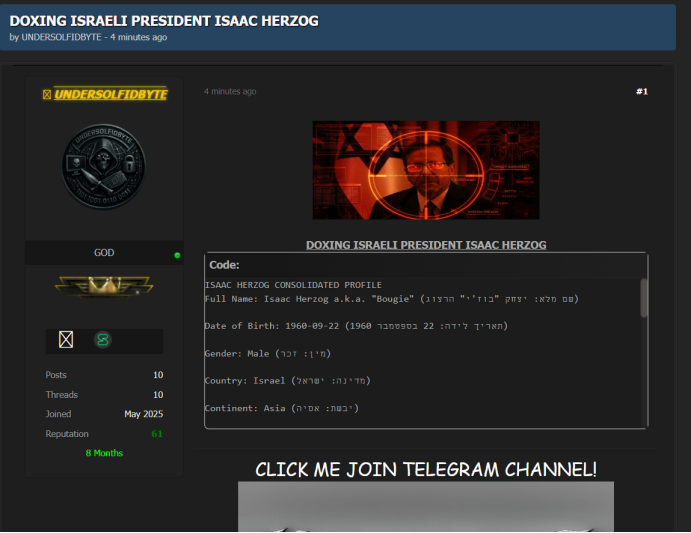 以色列总统President Isaac Herzog信息遭暗网泄露,涉嫌隐私与安全双重危机|0.zone暗网日报【第827期】