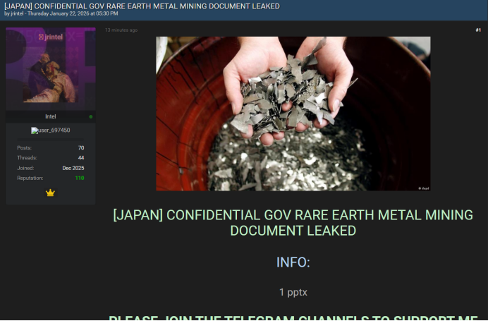 日本稀土金属开采机密文件泄露,涉及新型材料研发细节|0.zone 暗网日报【第832期】