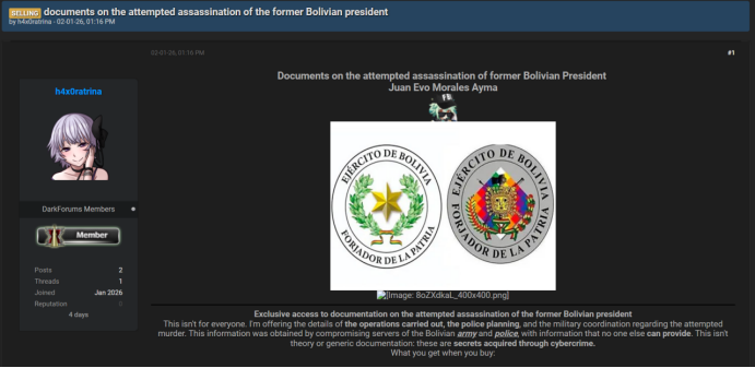 前玻利维亚总统Juan Evo Morales Ayma遇刺未遂的计划、刺杀细节以及军事协调暴露在暗网中|0.zone 暗网日报【第820期】
