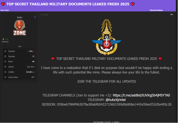 一位威胁行为者称他正在售卖一份泰国绝密军事文件,包含车辆过户协议、出生证明、地图等信息,包含医护人员、相关负责人的签名,还有机构印章,用于证明文件的合法性与真实性。