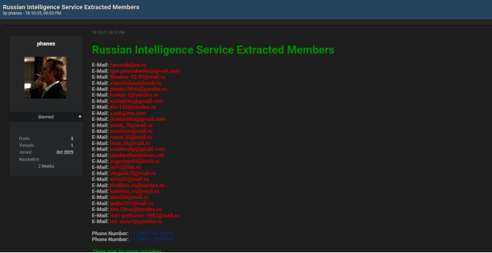 一位威胁行为者称他正在售卖一份俄罗斯情报部门成员数据,该威胁行为者称该数据是在情报部门提取获得,并给出了邮箱样例和手机号。