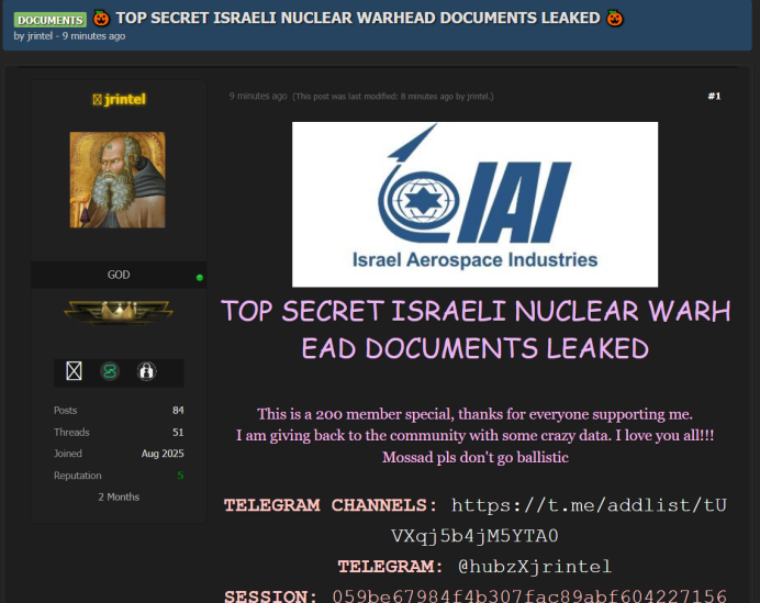 一位威胁行为者称他们正在售卖一份以色列国防承包商Israel Aerospace Industries的核弹头设计、开发、测试文件,涵盖设计构造、材料选择、制造细节、装填验收标准、环境与靶场测试、测试结果与结论等。