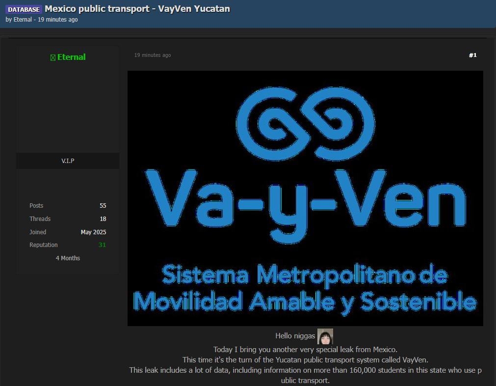 一名威胁行为者在暗网论坛上声称窃取并泄露了墨西哥尤卡坦半岛政府的公共交通系统 VayVen的数据,包括该州超过 160,000 名使用公共交通工具的学生的信息。