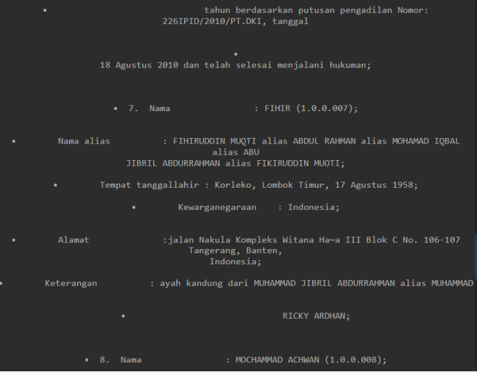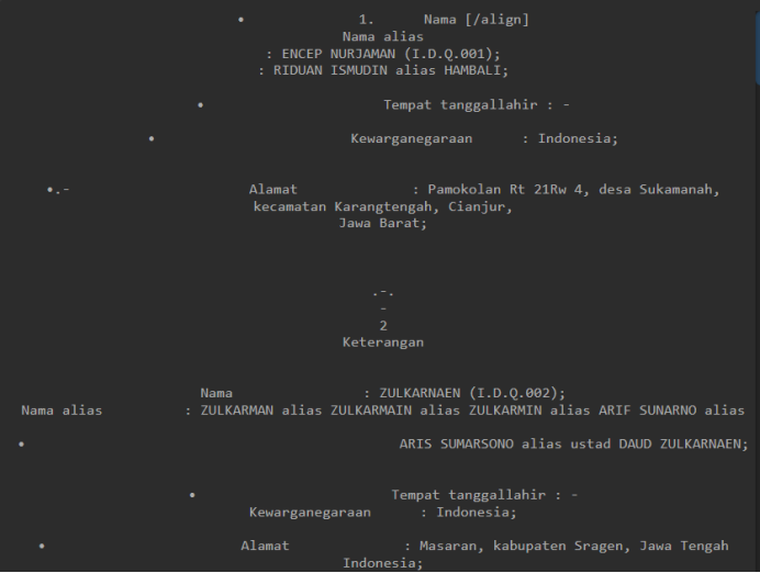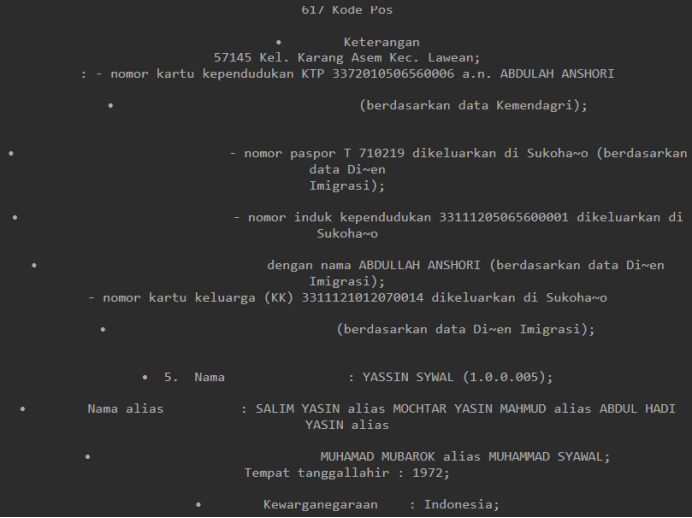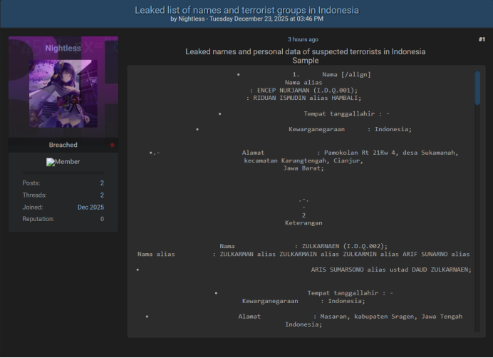 一位威胁行为者称他正在售卖一份印尼恐怖组织名单数据,内容涉及人物姓名、别名、国籍、地址等关键信息,该威胁行为者提供了样例。