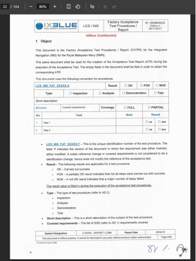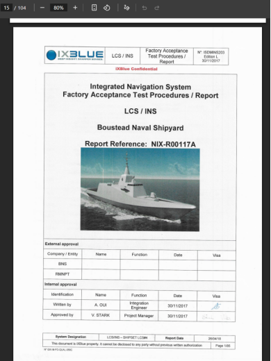一位威胁行为者称他正在售卖一份法国国防承包商iXblue与马来西亚海军合作的蓝图,包含iXBlue 公司为马来西亚皇家海军濒海战斗舰(LCS)项目提供的 “综合导航系统(INS)”工厂验收测试流程 / 报告。