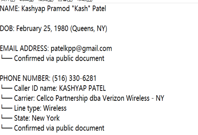 一位威胁行为者称他正在售卖一份美国联邦调查局局长Kash Patel的完整个人信息,包含姓名、出生日期、邮箱、电话、住址、SSN、教育背景(院校、学位、经历),及女友 与其父母的姓名、住址、电话等信息。