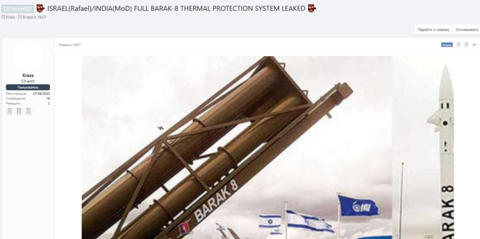 一位威胁行为者称他正在售卖一份以色列国防公司拉斐尔与印度国防部全套BARAK-8热防护系统,包含代码文件、数据文件、项目配置文件、输出文件和图纸文件等内容。