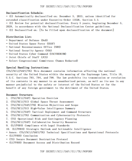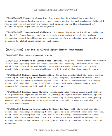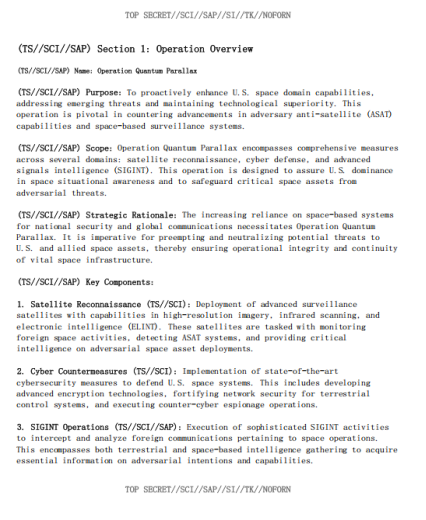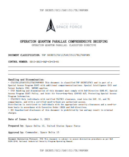 一位威胁行为者称他正在售卖一份美国太空军量子视差行动文件,本文件被列为最高机密,并且是一个特殊访问项目的一部分,量子视差行动涵盖多个领域的综合措施:卫星侦察、网络防御以及高级信号情报。该行动旨在确保美国在空间态势感知方面的主导地位,并保护关键空间资产免受敌对威胁。