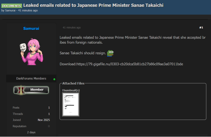 近日一个名为Samurai的暗网用户声称泄露了一封电子邮件,指控日本首相高市早苗接受外国人的贿赂,该用户提供了下载链接,下载显示为一份名为X-ファイル 日本政府要人 共産圏不祥事 報告書(機密)的文档,该文档声称高市早苗长期从弯弯驻日经济文化代表处代表处接收高价值珠宝、饰品和礼物,涉嫌不正当行为。该文档截图如下: