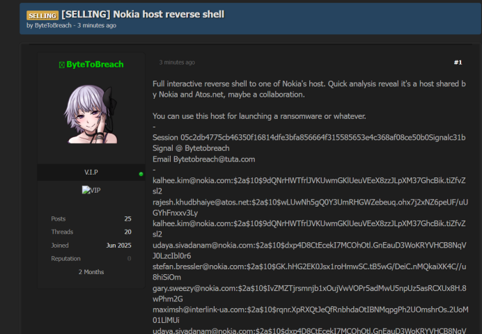 一名威胁行为者在暗网论坛上声称窃取并泄露了诺基亚主机Shell,据称该shell是诺基亚主机之一的完全交互式反向shell,该主机可能是诺基亚与Atos.net合作并共享的主机,并提供了通过该shell盗取的员工电子邮件地址、哈希密码。