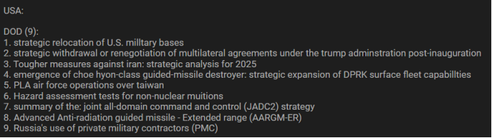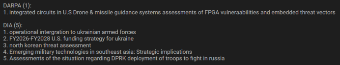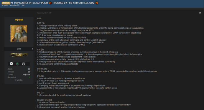 一位威胁行为者称他正在售卖一份顶级机密情报提供商的绝密数据,涉及美国国防部、中央情报局、DARPA、DIA、太空军、巴基斯坦、英国、俄罗斯等国家,涉及军事、国防、科技、政府文件、军事策略等重要文件。
