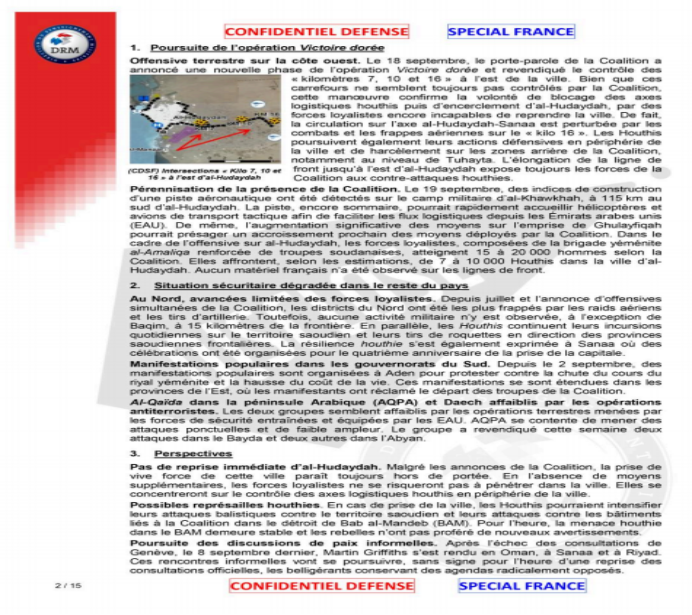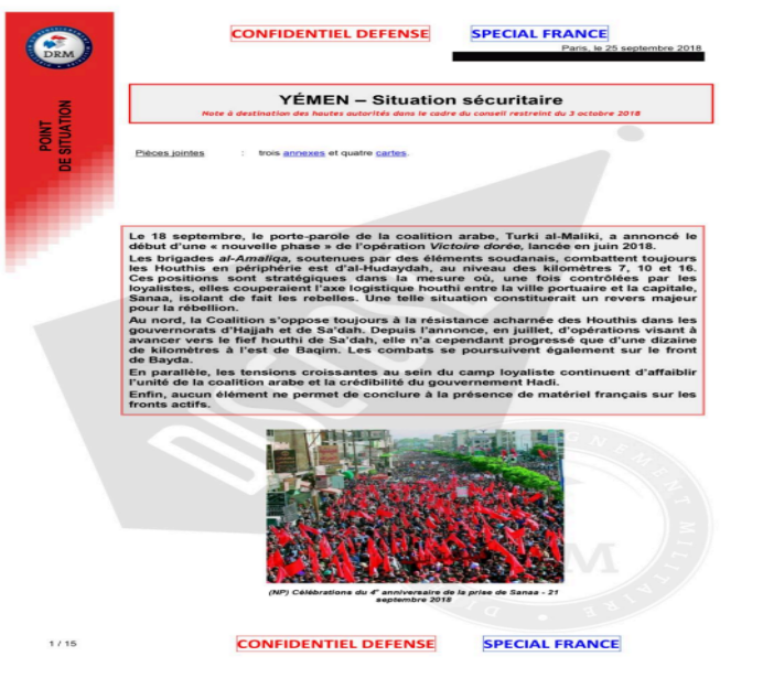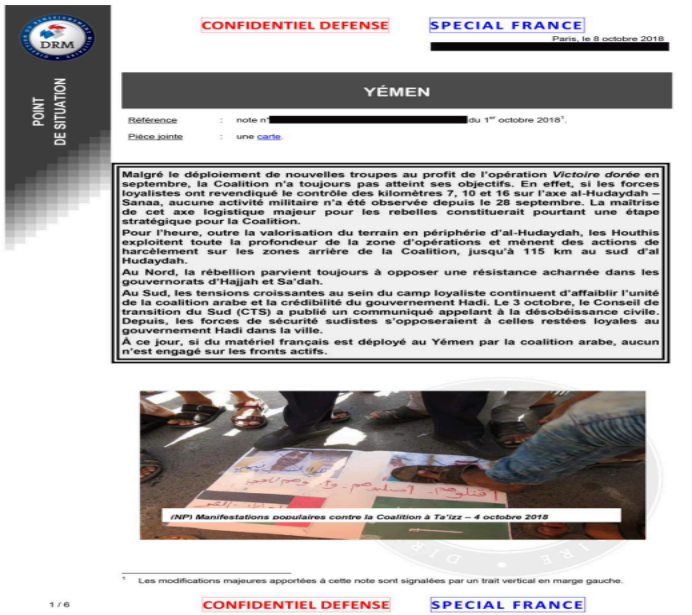 一位威胁行为者称他正在售卖一份法国官方国防机密文件,内容涉及法国武器出售给沙特阿拉伯和阿联酋,这份报告由法国军事情报机构DRM成员撰写,是在法国总统府爱丽舍宫举行的限制国防委员会会议上交给法国总统埃马纽埃尔·马克龙的。题为《也门:安全形势》,详细介绍了法国制造武器在也门冲突中的部署,并首次展示了法国制造武器的位置。