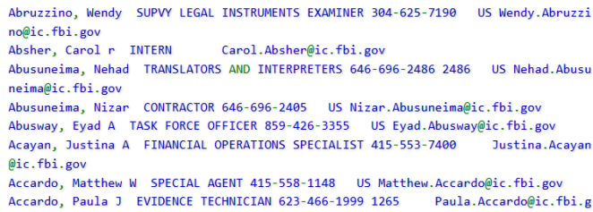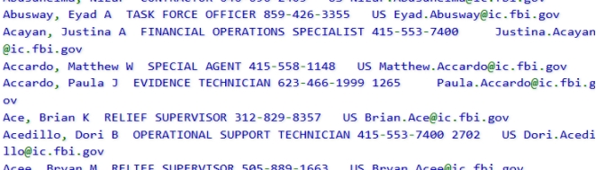 一名威胁行为者在暗网论坛上声称窃取并泄露了 22000条美国FBI特工数据,该数据包括姓名、电子邮件、电话、国籍、身份/雇佣类型等字段并给出了样例。