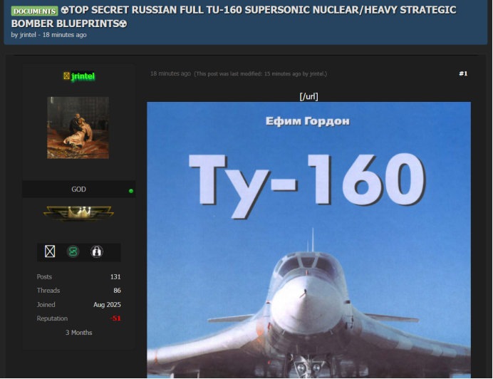 一位威胁行为者称他正在售卖一份罗斯TU-160 超音速核/重型战略轰炸机蓝图,TU-160 是俄罗斯一型超音速变后掠翼远程战略轰炸机。TU-160 轰炸机作战方式以高空亚音速巡航、低空亚音速或高空超音速突袭为主,在高空时可发射长程巡航导弹在敌人防空网外进行攻击;担任防空压制任务时,可以发射短距离导弹。此外还可以低空突袭,用核弹头的炸弹或是发射导弹攻击重要目标。