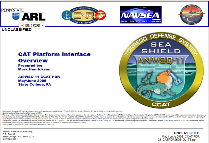一位威胁行为者称他正在售卖一份美国国防部CAT鱼雷手册数据,卖家称该数据包含两个PPT文件和一个草稿文件,CAT是美国海军开发的一种硬杀伤(hard-kill)反鱼雷系统,主要部署在航母(如Nimitz级)上,用于保护舰艇免受潜艇鱼雷攻击。